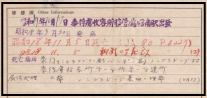 The reverse side of the index card. The transcript of this record is as follows: "He left Singapore Station in order to be transferred to the Thai POW camp on October 17, 1942. He fell ill on September 30, 1943. He died on November 5, 1943. He died of Miocardic Beri-Beri on November 5, 1943. Place of death: At the 1st detachment of the 1st branch of the Thai POW camp in Nong Pladuk village, in Ban Pong county, Kanchanaburi county in Thailand. Burial: We buried him at the cemetery of Nong Pladuk."