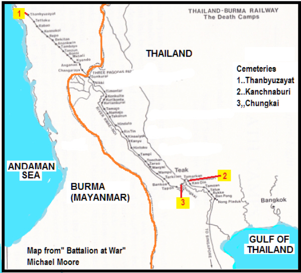He was originally buried at Wat Koke Mor., Nong Pladuk (the southern end of the railway) and moved to Chungkai in April 1947 |