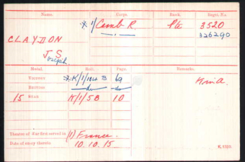 1901 census...Aged 4, Stanley was at 46 Duddery Road, Haverhill with his father Warren CLAYDON [48] silk weaver born Sturmer; his mother Alma [45]; brothers Harry [24] bricklayer's labourer, George [12], William [8] and Bert [1]; sisters Alice [14] and May [10]. All except his father were born in Haverhill. 1911 census...Aged 14, Stanley was at 38 High Street, Haverhill with his parents (father now a jobbing gardener); sister Kate [28] a sacking machinist; brothers William a fish monger's journeyman and nephew Bert (who seemingly was his brother in 1901 and whose parentage is not recorded). His mother had borne 11 children but lost 3 of them In 1917, when Bert enlisted, the family address was 17 Hamlet Road, Haverhill, but CWGC have his mother at Endway, Steeple Bumpstead. Bert served from August 1917 to March 1920, first in the 5th Suffolks and then the Labour Corps There are three Haverhill William Claydon that died in the war, but only two on the memorial. Joseph's brother William had gone to Canada, but returned and enlisted in the Cambridgeshire Regiment and died of his wounds in France in 1916. see here |
