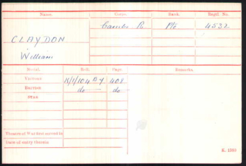 1901 census...Aged 8, William was at 46 Duddery Road, Haverhill with his father Warren CLAYDON [48] silk weaver born Sturmer; his mother Alma [45]; brothers Harry [24] bricklayer's labourer, George [12], Stanley [4] and Bert [1]; sisters Alice [14] and May [10]. All except his father were born in Haverhill. 1911 census...Aged 18 a fishmonger's journeyman, he was at 38 High Street, Haverhill with his parents (father now a jobbing gardener); sister Kate [28] a sacking machinist; brothers Stanley and nephew Bert (who seemingly was his brother in 1901 and whose parentage is not recorded). His mother had borne 11 children but lost 3 of them In 1917, when Bert enlisted, the family address was 17 Hamlet Road, Haverhill, but CWGC have his mother at Endway, Steeple Bumpstead. Bert served from August 1917 to March 1920, first in the 5th Suffolks and then the Labour Corps According to the report of his death, William left Haverhill and gone to Canada, but returned to UK to enlist when war broke out. There are three Haverhill William Claydon that died in the war, but only two on the memorial. His brother Joseph Stanley was awarded the Military Medal, served in the Cambridgeshire Regiment and died of his wounds in France in 1917. see here |