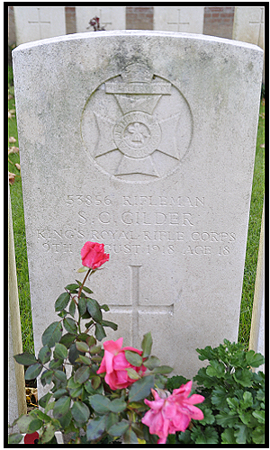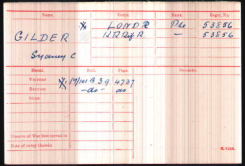 Sydney Clive GILDER was born in Great Yeldham (Halstead Q1-1900 4A:809), son of Frederick Charles and Rose Emma GILDER (née HASLER). 1901 census...Aged 1, he was at High Street, Great Yeldham, Essex with his father Fred GILDER [25] railway porter born Toppesfield, Essex and his mother Emma [24] born Stambourne, Essex. 1911 census...Aged 11, he was at High Street, Great Yeldham with his parents, brother Basil [9] born Great Yeldham; uncles Colin HASLER [26] (domestic gardener) and Maurice HASLER [22] (Thatcher) both born in Sible Hedingham. The pension card has his mother at 30 Camps Road, Haverhill. |