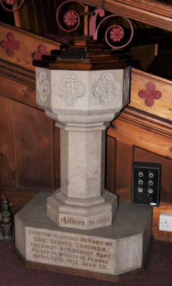 The font in the Old Independent Church was provided by Eric’s family as a permanent tribute. Dr Goodman, in memory of his son Eric presented to the Old Independent Church a beautiful font. Octagonal in shape. and in Gothic style, with carved panels, and made of Derbyshire marble.