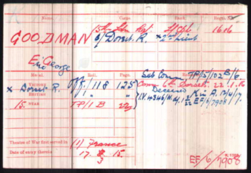 News has been received by Dr. T.H.Goodman of Haverhill that his son, Second Lieut. E.G.Goodman, of the Dorsetshire Regiment, was admitted to the 20th General Hospital Canvers (sic - it was Camiers), on July 8th, suffering from serious gun shot wound in the face.Lieut.Goodman was acting as bombing officer.