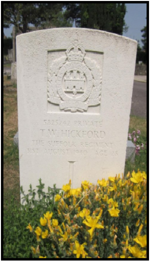 Thomas William HICKFORD was born in Haverhill on 16th July 1912 (Risbridge Q3-1912 4A:1732) son of Thomas William and Rose HICKFORD (née BARTRAM). From his father's Army records (Labour Corps), he had brother Frank [19-5-1902] born Clare]; sisters Eliza [12-1-1905], Phyllis [7-6-1910] and Rose May [15-12-1913], all born in Haverhill. He married Alice May HEARN [19-11-1911] in 1940 (Newmarket Q3 4A:3963), later of Broadstairs, Kent. She later married Albert E BRAY in 1963. In the 1939 register brother Frank (plasterer) and his wife Elsie were at 10 Croft Row, Haverhill.(One closed record). The rest of the family have not been identified in the 1939 register except Alice. She was at home at 8a Horseheath Road, Clare with her parents Joseph and Jane and brother Walter |