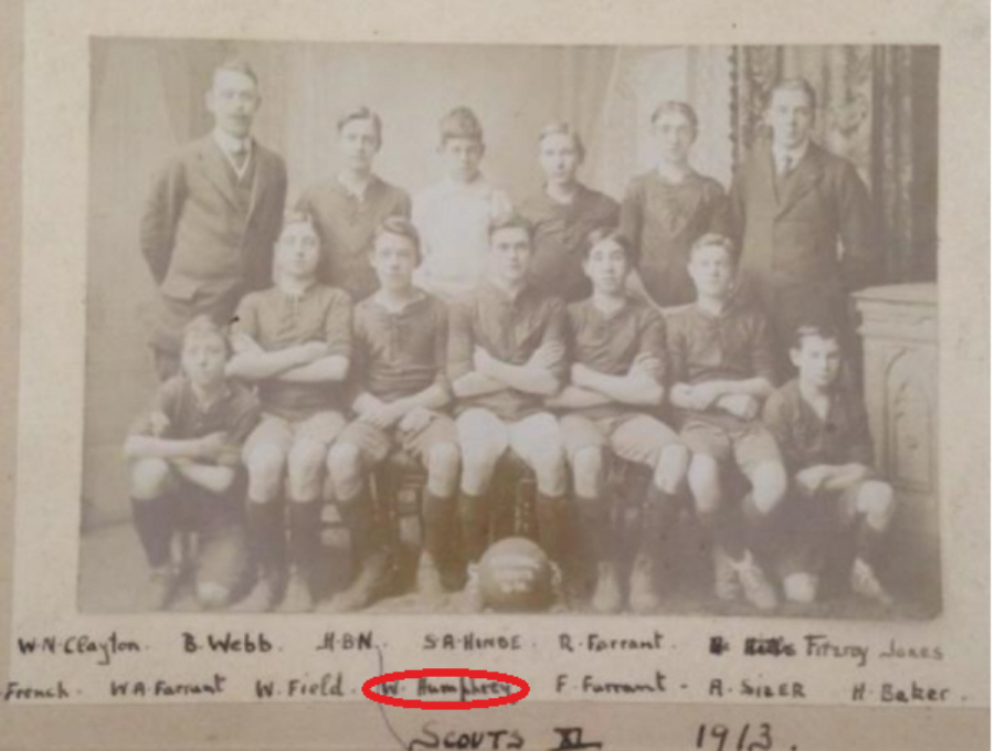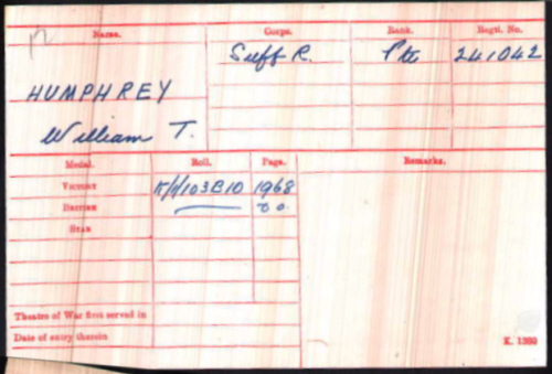 William Thomas HUMPHREY was born in Haverhill (Risbridge Q2-1891 4A:724), son of Alice HUMPHREY. The surname is at times HUMPHREY and other times HUMPREYS 1901 census...Aged 1, he was at 39 Eden Road, Haverhill with his grandfather George HUMPHREY [47] domestic groom born Ridgewell; his grandmother Eliza [47]; mother Alice [22] coat machinist, aunts Rose Lily [20] jacket machinist, Lizzie [18] jacket machinist and Edith Ellen [6]; uncles Arthur [14] apprentice shoe maker, Albert William [11] and Ernest [9]. All except his grandfather. were born in Haverhill. His grandmother died in 1902 and his grandfather in 1903. 1911 census...Aged 11 he was at 39 Eden Road, Haverhill with his mother Alice and aunt Edith Ellen. His mother married Harry CLARKE in 1919. His uncle Ernest HUMPHREY died just three weeks later, serving in France in the Suffolk Regiment. see here
