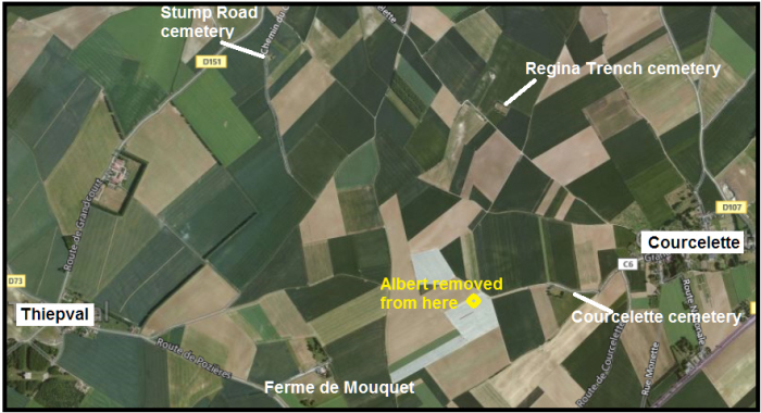 The South West Suffolk Echo of 21st October 1916 reported that:- "Mrs. W. Jennings, of 38 Camps Road, has been officially informed that her son, Pte. Albert Jennings of the Canadian Regt., was killed in action on the 16th. September. Pte Jennings had been employed at the Rose and Crown prior to his leaving for Canada " He enlisted in Regina, Saskatchewan on 21st September 1915, a single farm hand born in Haverhill UK on 31st December 1889. Next of kin his father at 38 Camps Road, Haverhill. 5 feet 5 inches (165.1 cm)tall, chest 32.5" to 35.5"(82.6 to 90.2 cm), brown eyes, dark brown hair, Church of England. Initially in the 46th Overseas Battalion, he sailed from Halifax, Nova Scotia on 23rd October 1915 on the SS "Lapland" and arrived in Devonport on 30th October.Posted with the 42nd battalion to France on 9th June 1916. He soon was laid low by influenza and admitted to 8th Canadian Field Ambulance on 24th June and forwarded to No 10 Casualty Clearing Station. The next entry on his records is "return from base, 16th September 1916. Sadly he was killed that same day, in what was quite possibly his first ever action. His body was found as shown below, no cross on the grave but identified by his disc and re-interred a few yards away at Courcelette cemetery in March 1919.. No "circumstance of death" card for him has been found. It was the second half of the Battle of the Somme and the battle for Courcelette was raging.. The attack was renewed on 16 September but without any real success. The Guards suffered heavily, making an unsupported attack, and had to be relieved. XV Corps attacked at 9.25 a.m. 14th Division was let down by the artillery, and after an ineffective bombardment was unable to make any progress. The 21st Division attack began bogged down passing around Flers and so fell too far behind the artillery barrage, and their only tank was destroyed by a shell. Brigade HQ in Flers was also destroyed by shellfire. The New Zealand Division fought off a German counter-attack, and then made some headway before being ordered to halt when news came through of the failure to their right. III corps also made little progress. The field where Albert's initial grave was found contained a mix of graves from Empire troops and British, several unidentified. They were all reburied next to one another in Courcelette in 1919. On 21st October, 1916 the South West Suffolk Echo reported that his parents had been officially informed that his death occurred during a charge against the Germans when he was struck from machine gun fire and killed instantaneously. A letter from the Chaplain of the Battalion said, "He is buried on the field with many other comrades …. I think he could have found no more honourable resting place than on the field where he served so splendidly". |