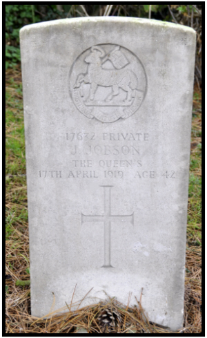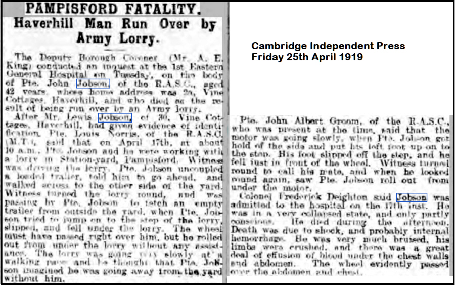 1881 census... Aged 4, he was at the Private House, Little Wratting with his father Thomas JOBSON, farm labourer [41] born Haverhill; his mother Emma [42] born Haverhill; sisters Harriet [18] and Emily [16] both tailor's factory hand, born Haverhill, Amelia [14] tailor's factory hand, born Little Wratting, Jane [8] and Kate [5] both born in Little Wratting; brothers Louis [12] and Charles [6 months]. All the boys were born in Little Wratting. 1891 census...Aged 14, he was at 60 Primrose Hill, Haverhill with his parents, sisters Harriet, Emily, Amelia, Jane and Kate, all factory hands; brothers Lewis (factory hand), Charles and Arthur [5] born Little Wratting. He married Mary Ann CLARKE in Q4-1899 1901 census...Aged 24, a fibre mat weaver, he was at 13 Burton End, Haverhill with his wife Mary Ann,[23] tailoress born Haverhill and their daughter Hilda Gladys [8 months] born Castle Camps. His parents were still at Primrose Hill with his brother Charles (boot/shoemaker); sister Amelia, now married to Alfred WEBB [33] railway engine driver, born Haverhill and their daughter Emily F [2] born Haverhill.