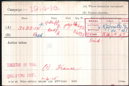 19th February 1887, son of Frederick and Harriett JOBSON (née SHIP). 1891 census...Aged 4, he was at 84 Burton End, Haverhill with his father Frederick JOBSON [32] labourer; his mother Harriett [32]; brothers Albert [8], Walter [3] and Arthur [5 months]. All were born in Haverhill. 1901 census...Aged 14, a farm labourer, he was at 23 Burton End with his parents; brothers Albert and Walter (both farm labourers like their father), Arthur, Stanley [7] and William [1]. 1911 census...Aged 25, he was at 116 Burton End with his parents; brothers Arthur, Stanley and William. All six children survived, but the war was to tragically change that, claiming 3 of them. He married Rose OSBORNE (sister of his brother Arthur's wife Ellen) (Risbridge Q3-1911) and lived at 35 Burton End and later Rose was at 84 Burton End. The pension card has his mother at 156 Burton End. This is unusual, in that the mother is recorded but not the widow, but then a further card was discovered which has his widow Rose (b.2-3-1891), living at 35 Burton End with their son Freddy William (b.2-2-1913) His brother Arthur was killed in action in France in 1916, see here and brother Stanley died of his wounds in Belgium in 1917, see here |