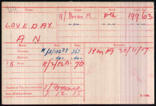 son of Henry Charles and Lily LOVEDAY (née NUNN). There are reports that his mother was Lily MARSH,which could make him nephew of Percy MARSH, but no such marriage registration has been found 1901 census...Aged 3, he was at 24 Mill Road, Haverhill with his father Henry Charles LOVEDAY [23] milkman and his mother Lillie [22]. All were born in Haverhill. At the time of Albert's birth, his father was a rope maker. 1911 census...Aged 13, he was at 68 Mill Road, Haverhill with his parents (father now a labourer and recorded as born in Kedington); his brother Herbert [8]; sisters Ethel [4] and Edna [1]. The new siblings also born in Haverhill. There had been 5 children but one had died. On his "Soldier's personal effects" entry legatee father Lance Sgt Henry is crossed out at the request of his father and replaced by mother Lily |