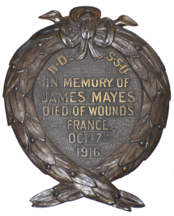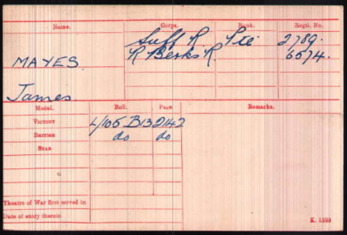 Joseph and Fanny MAYES (née HECKFORD). 1901 census...Aged 5, he was at Calford Green, Kedington with his father Joseph MAYS [38] farm labourer; his mother Fanny [37]; brothers Alfred [16] and George [14] (farm labourers) and Arthur [10]; sisters Emma [12], Annie [8], Laura [3] and Ethel [1]. All were born in Kedington. 1911 census...Aged 15 a farm labourer James Mayes was with his parents at 2 Chalkstone Hills, Haverhill; sisters Annie (clothing machinist), Laura (nursemaid) and cousin Ethel [1] born Haverhill. No record of parentage of Ethel. His brother Arthur married Martha MARSH in 1910, sister of Percy MARSH. see here |