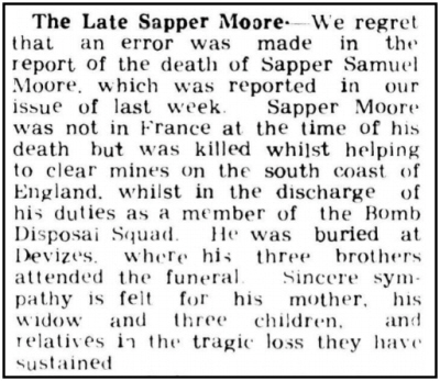 Thanks go to Lyn Dyson, West Lavington Parish Council, for help with the research and the photograph of Samuel and his grave. Samuel was killed while working with Sapper Corcoran and Corporal Ashford clearing mines from the beach at Frinton-on-Sea. This stretch of coastline had been mined in anticipation of a German invasion. All three men were killed. Samuel was buried at All Saints Churchyard Extension, West Lavington. |