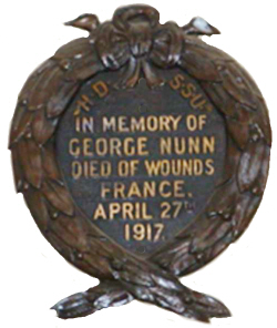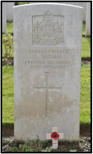 George Herbert NUNN, born Haverhill, (Risbridge Q4-1897 4A:762), son of James George and Jane NUNN (née JOBSON). 1901 census...Aged 3, at Withersfield Road, Haverhill with his father George NUNN [24] a mat weaver, born Haverhill and his mother Jane [28] coat machinist, born Little Wratting 1911 census...Aged 13, an errand boy, at 1 Down's Place, Haverhill with his parents James George (mat weaver) and Jane NUNN (clothing machinist); sister Ellen [6] and brother Frank (Philip Frank)[1] both born in Haverhill. His father's Army records exist (quite damaged) and give his wife as Jane NUNN of 33 Crowland Road, Haverhill and surviving children as Ellen [1904], Philip Frank [1909] Edith Winifred [1911] and Olive [1913]. His father joined the Suffolk Regiment (#15802) in October 1914, served in France from 30th May 1915 to ? and was demobbed in February 1919 in the Labour Corps. The South West Suffolk Echo reported on 4th May 1915:- "Mrs Nunn, of 33 Crowland Road, Haverhill has received sad news that her eldest son, Pte George Nunn of the Suffolk Regt., has died from wounds in a casualty clearing station in France.He was only nineteen years of age, and had been in France for eight months. The young soldier's father is also serving in France, where he had been for about two years. He had not seen his son since he joined up. Prior to the outbreak of war the deceased soldier was a member of the Territorial Force.The sad news was announced in the following letter written by the Sister in the clearing station:- "I am very sorry to have bad news to give you.Your brave little son George, of the Suffolks, was brought in on Wednesday dangerously wounded in the left leg. He was very much collapsed and it took us till afternoon of the next day to bring him round enough to have an operation, which was the one chance of saving his life.he seemed much better the next day,but last night blood poisoning set in and he grew rapidly weaker, until 6 pm this evening (April 27th) he passed peacefully away.He was a dear patient little lad and we would have given anything to save him. .Yours with sympathy.." |