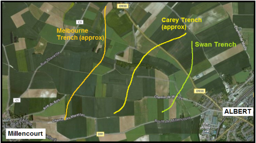 He enlisted in Sudbury. The battalion were holding Melbourne Trench (BHQ), Carey Trench and Swan Trench. The battalion war diary has:- "2/6/18 - Day quiet. Weather right. Work on trenches, widening and deepening.Night working parties strengthened wire." CWGC give just Thomas and one other killed. His original grave, identified by a cross, was found at 57d.X.20.d and he was re-interred in Ovillers in 1920. |
