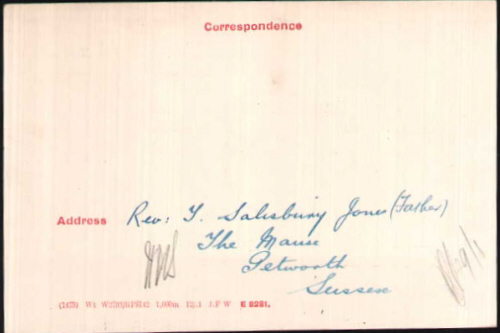 1901 census...Aged 4, he was at the Congregational Church Manse, Sutton Valence, Kent with his brothers Ivor Cynric [7] and Goronwy T [1], all born in Sutton Valence. Apparently that night in the care of domestic nurse Lizzie Harris and general servant Annie Rayner. His father Thomas SALUSBURY JONES [38] Congregational Minister born St Asaph, Flintshire was visiting John and Charlotte BADCOCK at Fir House, Wratting Road, Haverhill, with his mother Martha [37] born Paddington, London. His brother Tudor [5] born Sutton Valence was with his aunts Elizabeth and Matilda TIDY at 9 Hamilton Terrace, Marylebone. 1911 census...Aged 14, a scholar, he was at West End Manse, Haverhill with his parents; brothers Ivor Cynric, Tudor [15] and Gornwy Tidy; sister Olwen Evadne [5] (born Haverhill). His parents were still at West End House at the time of his death, later moved on to 16 Waterloo Avenue, Leiston. From his medal index card they were apparently at some time in Petworth,Sussex His elder brother Ivor was killed serving in France in the King's Own Yorkshire Light Infantry in 1916 see here |