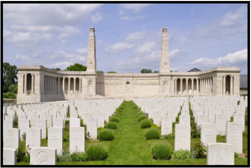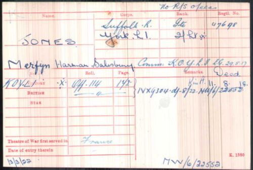The South West Suffolk Echo of 24th August 1918 reported that:- "The Rev. and Mrs. T.S. Jones received news last weekend that their third son, 2nd Lieut. Merlyn H. Salisbury-Jones, K.C.Y.L.I. has been killed in action. During a German counter-attack he was leading his platoon into action when he fell. His eldest brother, who belonged to the same Regiment, was killed two years ago. " Educated at Perse Grammar School, Cambridge, he joined the OTC there on 29th January 1913 and was Sergeant when he left school on 4th August 1916. He joined the Suffolk Regiment, 1st December 1916, Private 47698, where, at his medical, he was 5 feet 10.25 inches tall (178.4 cm), weighed 133 lbs (60.5 kg), chest 35" to 38" (88.9 to 98.5 cm). Posted to Pembroke College, Cambridge, he joined the 2nd Officer Cadet Battalion. He volunteered for military service in November, 1915 but was rejected on medical grounds. Later in December 1916 he joined No 2 OCB, Cambridge and trained there until the following April when he gained a commission in the Kings Own Yorkshire Light Infantry. He was commissioned in the K.O.Y.L.I (8th Battalion) on 29th May 1917 (L Gazette 29/5/1917). Merfyn was posted to the 8th Battalion King's Own Yorkshire Light Infantry and posted to the Ypres Salient in June 1917. Whilst serving near Ypres on 30th September 1917 he was wounded by a shell fragment which penetrated his left elbow. After being admitted to 14 General Hospital Wimereux the following day he was evacuated to England on almost three weeks later on 19th October for hospital treatment in King Edward VII hospital. He was to recuperate there until January 1918. He returned to duty on 10th February joining the 2nd Battalion as the 8th Battalion had gone to Italy. In April he was posted to France attached to the 2nd Battalion and was involved in action against the German offensives on the Western Front. On the 8th August they were in place for the start of the Battle of Amiens. On 11th August Merfyn was leading his platoon in a frontal attack near Beaucourt when he was hit in the stomach. He was carried to the dressing station but he died half an hour afterwards at 11am. The appendix detailing the action does not mention Merfyn, but it did result in one officer killed, four wounded, 27 OR killed, 79 wounded. His personal effects, returned to his father, were:- wristwatch , whistle and cord, spectacles in case, cheque book, stamps, fountain pen, wallet with letters and photos, and 80 francs (which were submitted to the Command Accountant).
