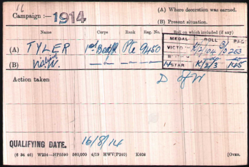 The South West Suffolk Echo of 19th June 1915 reported that:- "Bandsman W. Tyler (9450), of the lst. Bedfordshire Regt., died on the 8th. June 1915. He was the only son of Mr. & Mrs. Wat Tyler, of 8, Meetings Walk. He was 22 years of age and joined the army in 1909." He enlisted in Bury St.Edmunds. He died of his wounds in No.14 Field Ambulance which was attached to the 5th Division. At the time the Bedfords were involved in fighting around Hill 60 His appears to be another case of relatives not claiming or being unaware of the clasp to the 1914 Star, since he was certainly in France/ Flanders at the right time and was presumably involve at Mons. Without that clasp he cannot be properly recognised as an Old Contemptible |