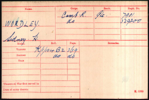 Sidney Herbert WORDLEY was born at 8 Duddery Hill, Haverhill on 7th August 1897 (Risbridge Q3-1897 4A:765), baptised in St Mary's Haverhill on