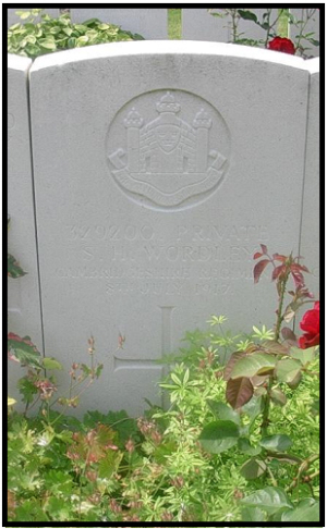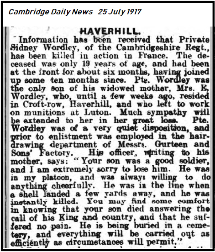 1901 census...Aged 3, he was at 20 Mill Road, Haverhill with his father Hezekiah WORDLEY [22] (no occupation given but a weaver on baptismal records), born Glemsford; his mother Ella [22] silk weaver and sister Grace Ella Gladys [1]; grandmother Adelaide WORDLEY (recorded as mother in law of Hezekiah). All except his father were born in Haverhill. 1911 census...Aged 13, waiter in confectionery shop, he was at 67 High Street, Haverhill with his widowed mother( now recorded as Sarah); sisters Grace and Olive Joyce [4]. His mother had lost one of her four children (George 1902-1902). His father had died in 1908 aged 29. The South West Suffolk Echo of 28th July 1917 reported that:- "Official news has been received that Pte. Sidney Wordley, of the Cambridgeshire Regt., has been killed in action in France. The deceased was only 19 years of age, and had been at the Front for about six months, having joined up some ten months since. Pte. Wordley was the only son of his widowed mother, Mrs. E. Wordley, who, until a few weeks ago, resided in Croft Row, Haverhill, and left to work in munitions at Luton. Much sympathy will be extended to her in her great loss. Pte. Wordley was of a quite disposition, and prior to enlistment was employed in the hair-drawing department of Messrs. Gurteen & Sons Factory. The following letter has been received from the 2nd. Lieut:- "It is with great regret and deep sympathy that am writing to tell you that your son, N0.329200, Pte. Wordley was killed on 7th. July whilst in the execution of his duty. Your son was a good soldier, and I am extremely sorry to lose him. He was in my Platoon, and was always willing to do anything cheerfully. He was in the line and a shell landed a few yards away and he was instantly killed. You may find some comfort in knowing that your son died answering the call of his King and Country, and that he suffered no pain. He is being buried in a Cemetery, and everything will be carried out efficiently as circumstances will permit. All things belonging to him have been taken care of, and in due time will be sent to you. If there is anything further you would wish to know, if you will write to me I will do my utmost to answer any queries. With deepest sympathy to you and your family in your great loss." |
