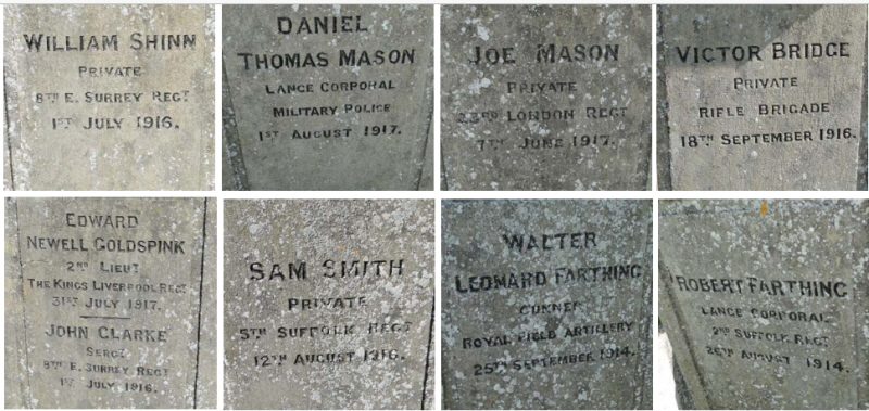 On the eight faces of the plinth are the names, the 3 o'clock face carrying two names. These are in the form of Forename, Surname above the rank, above the