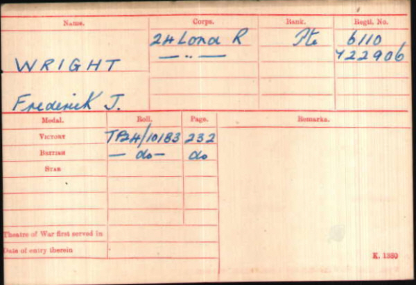 Frederick James Wright was born in Hawstead (4th qtr 1895 Thingoe 4a:747) son of Charles and Sarah WRIGHT (née DEARE)