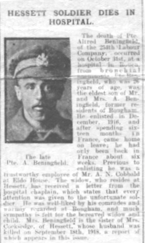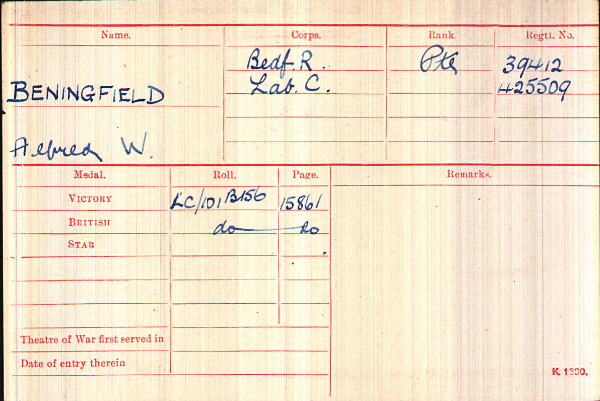 Alfred William Benningfield was born in Beck Row (2nd qtr 1893 Mildenhall 4a:787) son of Arthur and Elizabeth BENNINGFIELD (née FITCHES). Some records have him as Benningfield, other records have Beningfield. It is Benningfield with G.R.O. birth registration. 1901 census...Aged 8, he was "opposite the church" Fornham St.Martin with his father Arthur BENNINGFIELD [36] horseman on farm born Beck Row; his mother Elizabeth [37] born Barton Mills; sister Lottie [9] born Beck Row, Lily [2] born Saxham and Adeline [11 months] born Flempton; brothers Herbert [7] born Lackford and Walter [4] born Saxham. 1911 census...Aged 18, a farm labourer, he was at Blackthorpe, Rougham with his parents; sisters Lottie, Lily, Adeline and May [9] born Fornham St.Martin; brothers Herbert and Walter (both farm labourers), Erle (sic) [7] born Lackford and Fred [2] born Rougham. He married Edith M BULLETT in 4th qtr 1916. On the pension card his widow Edith M Beningfield [24-6-1893] was at Hessett Heath with his illegitimate daughter Sarah Mary Ann BULLETT [19-11-1910] His brother in law Bertram Cocksedge was killed in 1918, their wives were the sisters Edith and Susan Bullett see here |