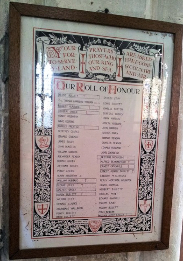 Inside the church is a glazed, hand written Roll of Honour detailing all who served in the Great War, identifying the fallen (all bar John Whiting).