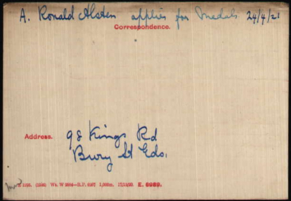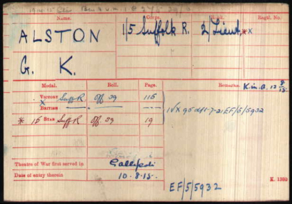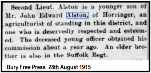 Baptised at St Michael and All Angels, Manningtree, Essex on 18th January 1894. 1901 census...Aged 7, he was at "Shrubland Lodge", Horningsheath, Horringer, with his father John E ALSTON [54] farmer born Great Bromley, Essex; his mother Annie E [45] born Liverpool; brother Alexander [13] born Manningtree. 1911 census...Aged 17, he was at 1/2 North Parade, Lowestoft, at school. His parents were at the same place in Horringer with his sister Emma Marjorie [24] born Manningtree, and brother Alexander (working on family farm.) His mother had lost 4 of her 7 children. |