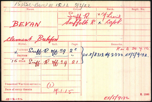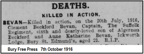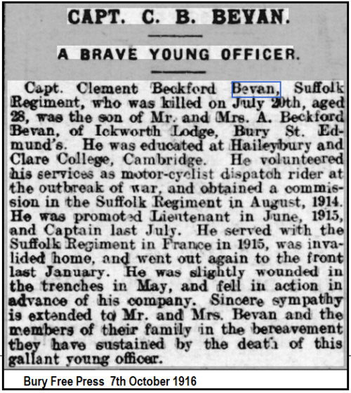 Clement Beckford Bevan was born in Bury St.Edmunds(3rd qtr 1893 4a:761), son of Algernon Beckford and Anne Katherine BEVAN (née PETTWARD).