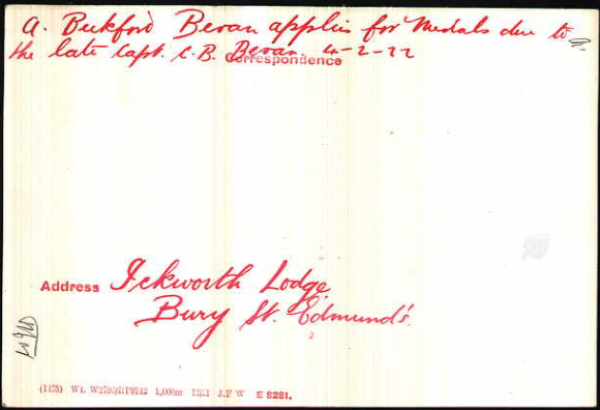 1901 census...Aged 7, he was at 8 Northgate Street, Bury St.Edmunds with his father Algernon B. BEVAN, J.P. [45] bank managing director born Bury St.Edmunds; his mother Anne [42] born Finborough; sister Frances A [14] and brother Bernard B [4]. All the children were born in Bury St.Edmunds 1911 census...Aged 17, a student, he was at Ickworth Lodge with his parents; brothers Edward [27] timber merchant and Bernard (scholar); sisters Frances Ann [24] and Katherine [18]. His father died in 1924. |