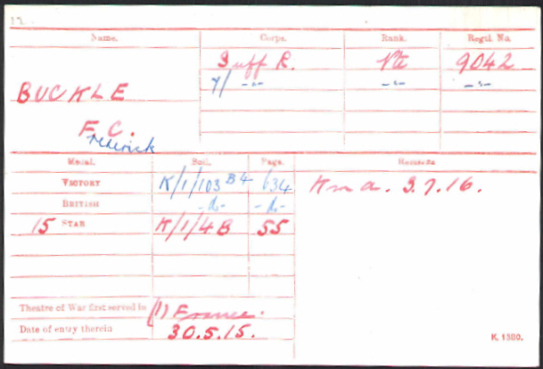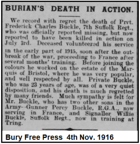 Born in 1893 (3rd qtr Bury St.Edmunds 4a 768) son of Charles and Louisa Fanny BUCKLE (née VIGOR)