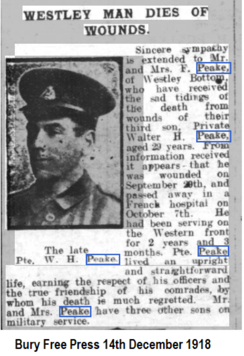 1891 census...Aged 1, he was at Swan Street, East Harling, Norfolk with his father Frank PEAKE [28] farm labourer; his mother Annie M [25]; half brother Charles B BARNARD [7] and brother Albert J [4]. All were born in East Harling. 1901 census...Aged 11, he was at Garboldisham Road, East Harling with his parents; brothers Albert and Eric G [5]; sisters Doris [8] and twins Myrtle May and Olive Rose [2]. 1911 census...Aged 21, under gardener domestic, he was at Westley Bottom (just inside Horringer parish) with his parents; brothers Albert James (stockman), Eric George (under stockman) and Ralph Bernard [1] born Westley; sisters Myrtle May, Olive Rose, Kate Maud [9] and Mildred Gladys [6] both born Horringer and Ida Vivienne [3] born Westley. His mother was at Westley Bottom on the pension card. |