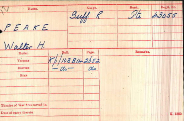 Walter Henry Peake was born in (4th qtr 1889 Guiltcross 4b:245) son of Frank and Annie Maria PEAKE (née BARNARD).
