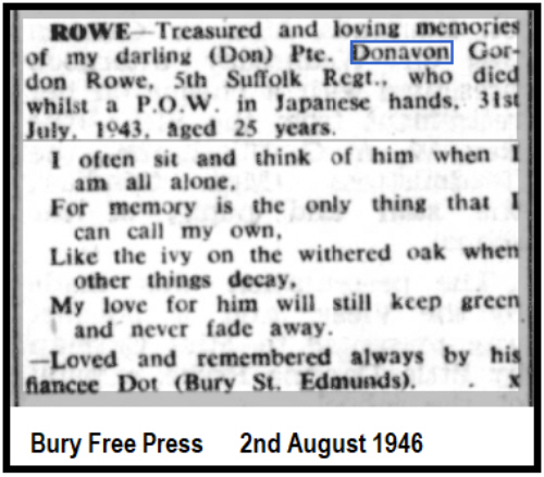 Donavon Gordon Rowe was born in Horringer (3rd qtr 1917 Bury St.Edmunds 4a:1306) son of Eileen Freda ROWE, daughter of William and Jane ROWE.