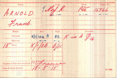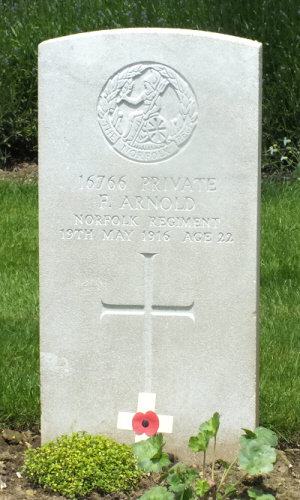 Frank was born in Hockwold cum Wilton, registered Thetford Q2-1894 [4B:367]. He was the third son of William and Eliza ARNOLD (née CURTIS) of Nursery Lane, Hockwold
