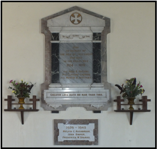 The war memorial for Honington consists of two marble plaques in All Saints Church. Unveiled on 5th December 1920 by the Duke of Grafton and dedicated by Canon W.Farmilae An engraved tablet made from four different coloured types of marble, mounted on the north, inside wall of the church. The main tablet commemorates just 3 names who died during the Great War. Rank, first name, any other initials, and surname are given. Beneath is a small rectangular tablet commemorating a further 3 who died in WW2. No rank is given, but first name, initials and surname are given. There is also a Roll of Honour scroll with the names of those that served, only Clifford Goddard is annotated as killed, Fred Cutting and Martin Stutters are not annotated as killed. However a Sidney Rogers is annotated as killed but is not on the war memorial, it is believed he is the man named on the Troston war memorial. The inscription on the Great War plaque is:- On a scroll on a pediment above the panel IN THE MEMORY OF THE MEN OF THIS PARISH WHO DIED IN THE GREAT WAR 1914-1919 PTE FRED E. CUTTING PTE CLIFFORD GODDARD PTE MARTIN H.STUTTERS and on a lower panel:- MELVIN C. RUSHBROOK JOHN SIMPER FREDERICK W. SPARKE and in the morning, we will remember them