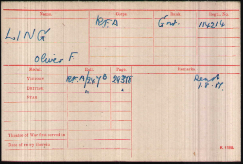 Oliver Frederick Ling was born in Hundon on 25th July 1897 (Risbridge Q4-1897 4A:775), son of Frederick and Elizabeth Martha LING (née LING).