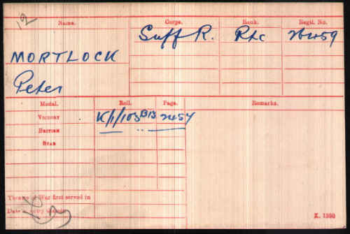 He was admitted to Hundon Board School in April 1888, leaving on 14th August 1895. 1891 census...Aged 8, he was at Mount Pleasant, Hundon, with his father Timothy MORTLOCK [50] farm labourer; his mother Sarah [44]; sisters Hannah [10] and Martha [2]; brothers William [14] and George [12].All were born in Hundon. 1901 census...Aged 18, a farm labourer, he was at Babel Green, Hundon with his parents, brother William (road labourer) and sister Maud [12] (Martha ?) 1911 census...Aged 28, a farm labourer, still single, he was at North Street, Hundon with his widowed mother. She had born 10 children but lost 3 of them by 1911. |