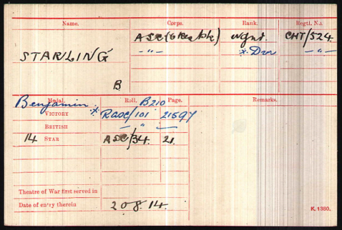 Benjamin Starling was born in Hundon on 25th April 1892 (Risbridge Q2-1892 4A:718), baptised in Hundon All Saints on 24th July 1892 son of Harry