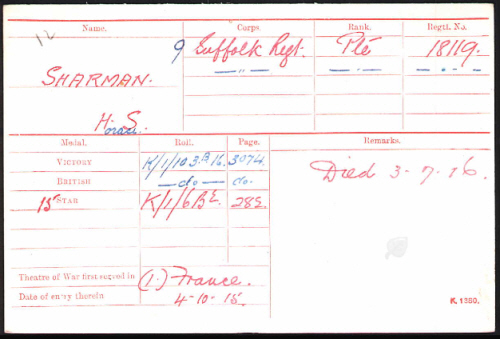 He enlisted in Newmarket. The war diary :- "July 3rd- At 3:15 am the battalion made a frontal attack on Ovillers on a frontage of 200 yards; the disposition of the Battalion was as follows:- "D" Coy on the right, "C" Coy on the left, supported by "B" Coy on the right , "A" Coy on the left. On the right of the battalion was the 5th Royal Berks and on the left the 37th Brigade, the 36th Brigade being in reserve. Two companies of the Essex Regt were in support to each battalion, the Norfolks being in reserve. Zero was 3:15, ten minutes before zero the leading waves advanced under cover of the bombardment and at the hour of zero the battalion assaulted in eight successive waves. The first 4 waves (D and C Coys) penetrated to the enemy's third line and portions of them into the village itself, but owing to the darkness, touch was lost with succeeding waves and with the 5th Royal Berks on the right, so that the leading waves were not supported closely enough, thus allowing the Germans to get in between the waves and cut off the leading ones at the 3rd line of resistance, it was at this 3rd German line that the chief casualties occurred and the assault was brought to a standstill. the two companies of the Essex Regt moving up in support were too far behind and were practically annihilated by machine gun fire during the advance across the open. The casualties in the battalion were 21 Officers and 458 O.R. killed, wounded or missing,though some of the missing eventually rejoined the battalion during the following night". 158 men died, all bar 2 of those with known graves are in Ovillers Cemetery, but 112 have no known grave and are commemorated on the Thiepval Memorial to the Missing of the Somme (amongst over 72,000 such names). Horace fell with George Ranns see here The Bury Free Press of 25th August 1917 reported:- ICKLINGHAM MAN MISSING Official notice has been received this week by the parents of Private Horace Silverton Sharman, 7th Suffolks, who has been missing since July 7th 1916, that is must be presumed that his death took place on or about that date.....
