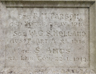 PTE B M PARSON 4TH YORKS 23.IV.1918...SGT W.G.S.HOLLAND AUS.F.ART. 1.XI.1918...PTE S AMES 127TH LAB.COY 22.I.1919