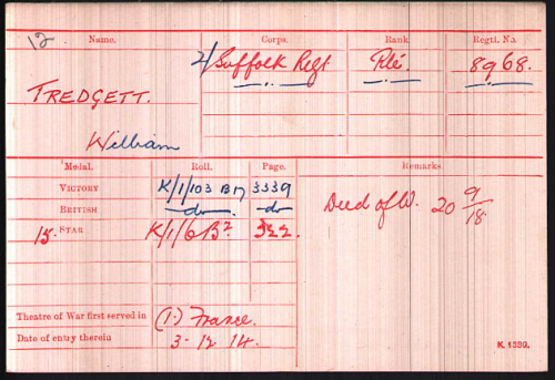 1901 census...Aged 5, he was at Bury Road, Kentford with his father Frederick Tredgett [37] domestic groom born Chevington; his mother Annie M [34] born Dalham; brother Frederick [14] farm labourer; sisters Phyllis [11] and Margery [8] both born in Moulton, Dorothy [3] born Bardwell and Emily [6 months] born Kentford. 1911 census...Aged 15, a labourer, he was in Kentford with his parents, sister Margery, brother Frederick [labourer], sister Emily and three more siblings, Lilian [7], Harry [5] and Thomas [4] all born in Kentford. His parents moved to 70 Eastgate St, Bury St.Edmunds. His brother Frederick was also killed, in France in March 1918,whilst in the Royal Garrison Artillery. see here Both brothers are named on the Bury St Edmunds Roll of Honour, for some reason only Frederick is on the Kentford memorial |