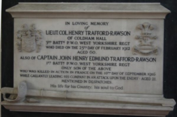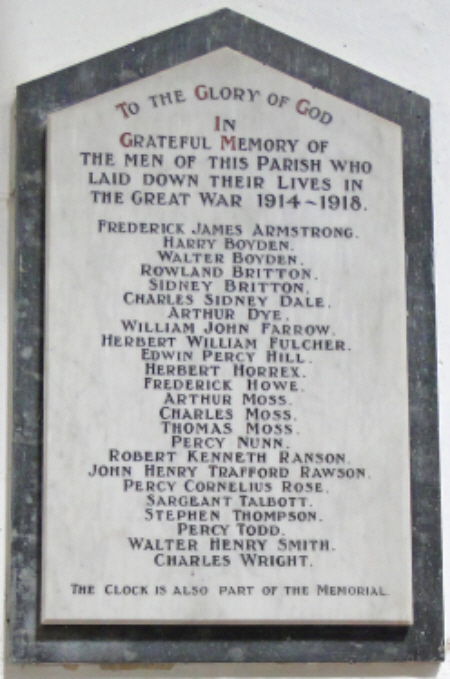 The war memorial is a white marble plaque on a black base, 86cm high x 58cm wide, on the wall in the church, unveiled on 7th August 1921 In addition there are memorials inside the church to Capt.Benjamin Trafford-Rawson.