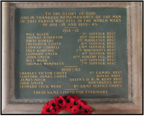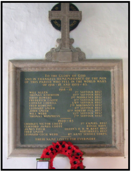 The dedication reads :- AND IN THANKFUL REMEMBRANCE OF THE MEN OF THIS PARISH WHO FELL IN THE WORLD WARS OF 1914-18 AND 1939-45 __________ 1914-1918 WILL ALLEN THOMAS ATHERTON DAVID BOWERS FREDERICK COOTE CONRAD CORNELL FRED ROWLING LEONARD SMITH JOHN SMITH WILL WEBB THOMAS WIMPRESS _________ 1939-45 CHARLES VICTOR COOTE CLIFFORD JAMES COOTE JAMES FITCH FRED SMITH LEONARD CECIL WEBB __________ THEIR NAME LIVETH FOR EVERMORE In addition there is a memorial to Lieutenant William Harold RYDER in the form of the remains of the propeller of his crashed aircraft. William is actually commemorated on the Great Thurlow war memorial. The family owned the Thurlow Estate at that time.