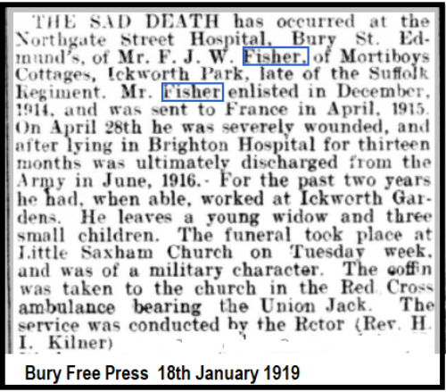Frederick John William Fisher was born in Wetherden (2nd qtr 1886 Stow 4a:737) son of John and Elizabeth FISHER (née MATTHEWS)