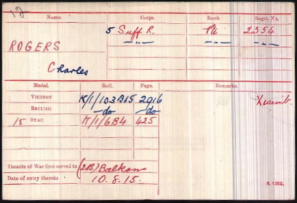 Charles Rogers was born in Little Saxham (4th qtr 1894 Thingoe) son of Alfred and Amelia ROGERS (née CHINERY)