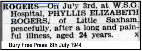 Phyllis Elizabeth Rogers was born in Little Saxham on 13th May 1920 (2nd qtr 1920 Bury St.Edmunds 4a:2023) daughter of Jack and Alice