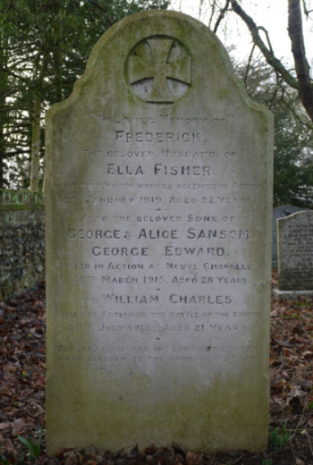 William Charles Sansom was born Wetherden(1st qtr 1895 Stow 4a:846) son of George and Alice SANSOM (née SCROBY) 1901 census...not found in this census...there is at Uppertown, Wetherden a family, CURTIS, with father George born Tostock, mother Alice, George [14] and Albert James [13], Florence [10], Ella [8], William [6],Hilda [4] and Ada Maria [2]. Ada died 1902 as SANSOM and in 1903 another Ada Maria was born -SANSOM-SCROBY). All new siblings born in Wetherden. All were registered as SANSOM with mother's maiden names SCROBY. There is no trace of any reason for a name change, they are all still in Uppertown in 1911 as CURTIS. They all appear to use the SANSOM name on official document such as marriage or death but not the census ? 1911 census...Aged 16, cow man, he was at Upper Town Wetherden with his parents; brother Albert (horseman); sisters Ella, Hilda, Rose (10) and Ada Maria [8] The family name was CURTIS. . From William's pension card is can be seen that the parents George and Alice had moved to Crows Wood Lodge, Little Saxham from New Cottage, Horringer Hall. and were SANSOM His brother George SANSOM was killed in 1915 see here and his brother in law Frederick FISHER, died at home of his wounds in 1919 see here |