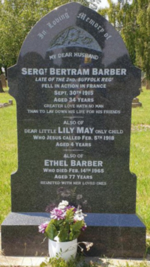 Born Lakenheath..registered Mildenhall Q4:1880 [4A:589]. 1881 census...Aged 5 months, living at Undley Road, Lakenheath with his father- George BARBER [34], a general labourer born in Lakenheath and his mother- Rebecca (née PALMER) [30] born Lakenheath. His father died in Q4-1889 (Mildenhall 4A:347) and his mother married George TURRINGTON in Q4-1890 (Mildenhall 4A:1330). 1891 census...Aged 10, living at Farrows Yard, Lakenheath with his step-father, George TURRINGTON [34] a labourer born in Lakenheath, and his mother. A 7 years old James TURRINGTON is recorded as a lodger. 1901 census...Bertram was not found in this census. Quite possibly he is in the Army somewhere. His mother and step-father had moved to Flempton Green, Flempton with their son George [9] born in Lakenheath. 1911 census... Aged 30, he is single, a Corporal in the Suffolk Regiment, stationed at the Depot at Out Risbygate, Bury St.Edmunds.His mother, stepfather and half brother George were in Flempton In Q4:1912 He married Ethel BURROUGHS (Bury St.Edmunds Q4-1912 [4A:2001](b.17-8-1887) She was at 2 Ipswich Terrace, Bury St. Edmunds after his death. They had a daughter, Lily May BARBER (Bury St Edmunds Q4-1913 4A:1781) who sadly died 5th Feb 1918. |