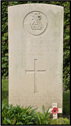 29211 (late 26586) Sjt. C. Brooks (Ludlow) For conspicuous gallantry and devotion to duty. During a counter-attack, when his platoon officer had become a casualty, this NCO took command of the platoon, leading them with conspicuous gallantry and skill, he re-captured and re-established the portion of the line that was his objective. He then went out in broad daylight with a fighting patrol and drove the enemy out of a strong point and captured a machine gun. Later he brought in two wounded men under heavy machine gun and rifle fire. The action that his DCM was awarded for took place at Montagne-de-Bligny on 6th June 1918. Bligny Hill is in the Champagne region of France and was where the Germans had switched their attentions to the much weaker French sector� an area where British troops had not previously been involved. 4th K.S.L.I. made a fighting retreat from Chambrecy, being rapidly reduced to only 350 men by June 5th, when it was halted near the Montaigne de Bligny, a hill dominating the area. The 4th K.S.L.I.were in support initially, with the N. Staffordshires and Cheshires holding the hill. At around 6.00 a.m. on the 6th June, the German attack began and by 8.00, the North Staffs and Cheshires were taking heavy casualties on Bligny Hill. By 9.30 a.m., the Germans had taken the hill and the Cheshires and North Staffs were fighting their way down its slopes towards the 4th KSLI, who were ordered to counter attack at 12.45 p.m., after a brief artillery barrage; its aim was to retake the crest and drive off the German defenders. The barrage never happened, but the attack went ahead anyway. From their trench line near Chaumuzy, the battalion had to cross about a mile of open fields, full of standing corn, in clear view of the Germans on Bligny Hill. Of the fewer than 200 men of 4 K.S.L.I. who attacked across the open fields, 80 were casualties by the time the foot of the hill was reached. Here they met the remnants of the N Staffs and Cheshires and together, despite intense enemy fire they succeeded in driving the Germans back down the hill. All this left only 150 men to hold a 1 � mile front. They also had to contend with an artillery barrage, from our own guns, the barrage promised for earlier in the day !. Down to 100 effective men, they were surprised to be ordered to retire, but their commander replied that they could not move. Fortunately they were relieved around midnight by the Northumberland Fusiliers. Not only was Sgt Brooks decorated for his efforts that day, but the 4th Battlion were awarded the Croix de Guerre, the citation reading : The citation stated : "On the 6th June 1918, when the right flank of a British Brigade was being seriously threatened by the progress of a heavy enemy attack, the 1-4th Battalion of the King�s Shropshire Light Infantry, which had been held in reserve, was called upon to counter-attack an important position from which their comrades had just been ejected. With magnificent dash, this Battalion rushed the hill on which the enemy had established themselves, inflicting heavy losses on them and in the course of hand-to-hand fighting captured an officer and 28 other ranks. Thanks to this gallant and spirited recapture of the key to the whole defensive position, the line was completely restored. The dash, energy and intrepidity with which, on this memorable occasion, the 1-4th KSLI carried all before it, was largely responsible for the retrieval of a situation which had temporarily become critical.� Since Claud died of his wounds, in the absence of his Army records, it is impossible to work out exaxctly how or where he was injured. The records do not show him being wounded at the time of his DCM exploits. The Bury Free Press of 21st September 1918 reported:- LAKENHEATH SERGEANT DIES IN FRANCE The sad news was recently printed by this journal that another Lakenheath man has made the great sacrifice. Sergeant Claude Brooks, of the Shropshire Light iInfantry, having died at a field ambulance station in France on August 12th as the result of wounds received during the recent severe fighting. The deceased soldier , who was a native of Lakenheath was the fourth son of Mr.and Mrs.Brooks of Littleport; he was well known and warmly respected for hislovable disposition and upright character, and the whole hearted sympathy of the residents of Lakenheath goes out to the bereaved parents in their great loss |