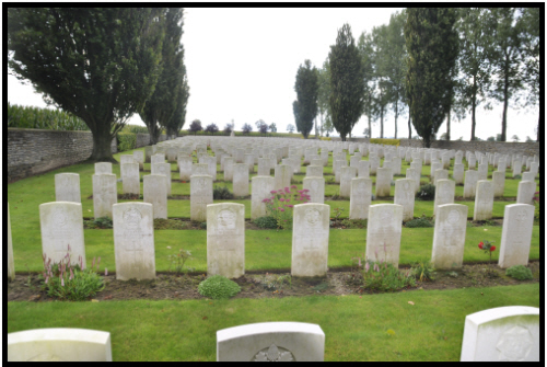 He enlisted in Lakenheath, giving his residence as Bury St Edmunds. Originally in the Royal Fusiliers he was transferred to the Manchester Regiment. His battalion moved to billets in Basseux on 3rd April where training was carried out in preparation for the pending assault on the Hindenburg line, but it appears that Arthur had been attached to the 21st Mortar Battery the whereabout of which have not been found for that time. Since he died of his wounds it seems impossible to ascertain where and when he was injured. The site of the cemetery was chosen in May 1916. It was used from June 1916 to May 1917 by the 20th and 43rd Casualty Clearing Stations, in February 1917 by the 1/1st South Midland, and from April to June 1917 by the 32nd. The whole of plots VII, VIII, IX and X were filled in April and May 1917, the months of the Battles of Arras. |